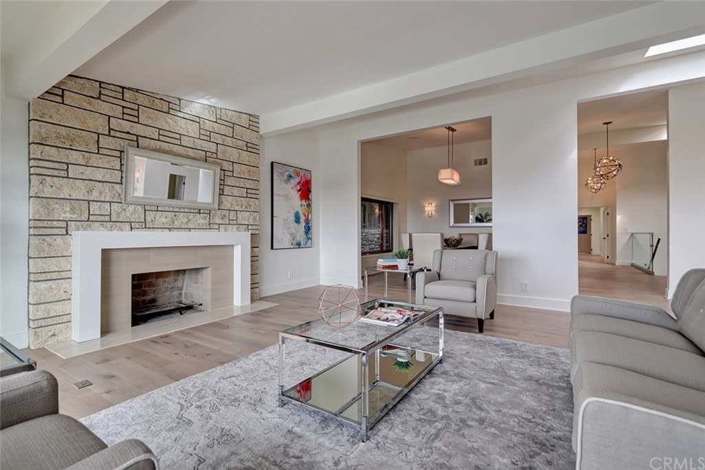 Perched on a picturesque Palos Verdes hillside at the end of a cul-de-sac, this gorgeous home was transformed by Lori Dennis of HGTV, into a 4,295 square foot harmonious contemporary showplace with demur grandeur and beauty. Broad canyon views and sweeping panoramas of the Pacific Ocean from Catalina Island to Point Dune are visible from most of the large-scale living spaces. Lofty vaulted ceilings and with skylights drench the smoky white oak floors in natural light. Sleek espresso cabinets and a white island topped with white caesarstone and a complete array of stainless KitchenAid appliances highlight the kitchen. The backsplash has built-in USB ports. A pantry wall lends a large amount of storage to a breakfast nook with big ocean views. Glass railings enhance the architectural lines of the interior and exterior, and an extensive amount of deck space and hardscape play area with flagstone drive surround this home. The master bedroom has Catalina and canyon views and an opulent master bath has stone and glass tile and caesarstone counters float on the espresso cabinets. There are custom light fixtures throughout this open, airy floor plan. Stream music to wireless speakers throughout the interior and exterior of this home. The laundry room incorporates a stylish “mud room”. The 3-car garage offers plenty of storage, and there is even an outdoor shower. Security cameras offer a remote look throughout the home, making this gated estate a private oasis on the hill.